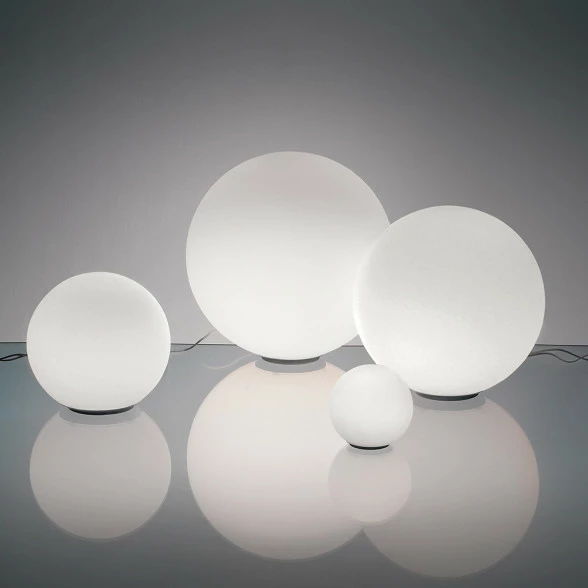 Designed by Michele De LucchiManufactured by ArtemideSpherical table lamp for diffused incandescent lighting.A minimalistic design featuring a classic, simple globe in acid-etched blown glass atop a hidden base of thermo-plastic resin.Dioscuri 25, 35, and 42 are dimmable.Quickship available in 14, 25 and 35.