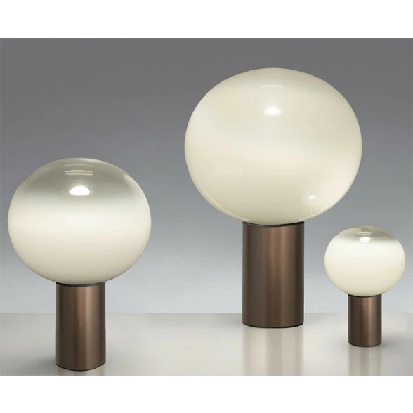 Designed by Matteo Thun + PartnersManufactured by ArtemideSpherical table lamp with raised base provides a softly diffused light on the table top and casts a warm light in its surrounding environment. This modern and elegant table features hand-blown glass mounted on an aluminium base that is finished in either brass or bronze.Comes in three sizes, Laguna 16, Laguna 26 and Laguna 37.