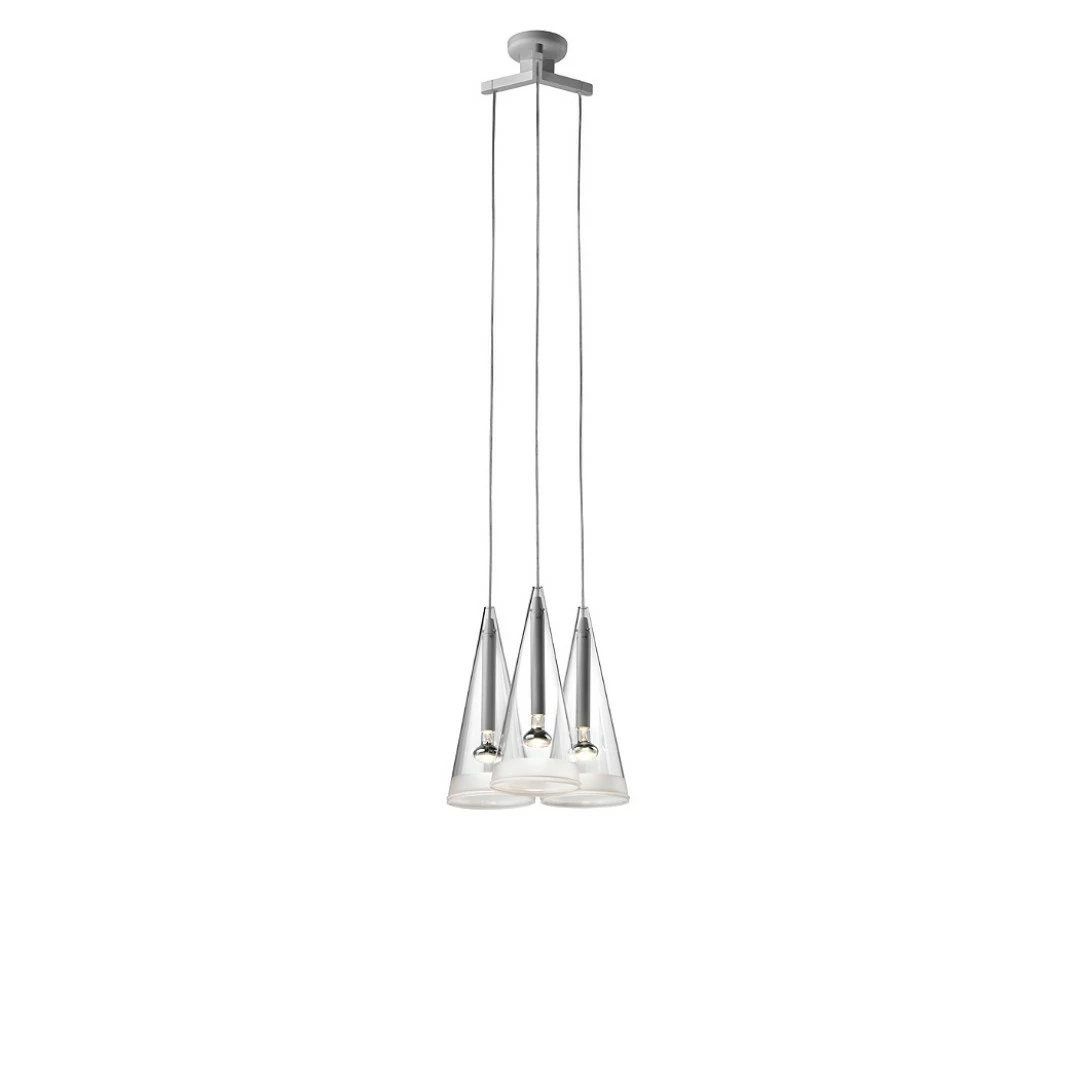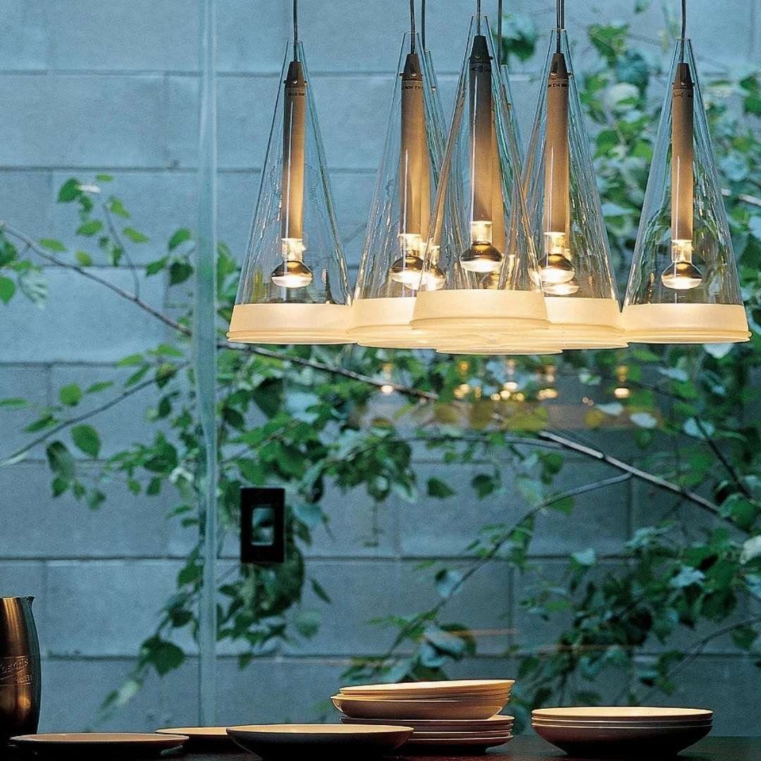 Designed by Achille CastiglioniManufactured by FlosDesigned by Achille Castiglioni, The Flos Fucsia Pendant Light has a sleek refined exterior and elongated internal light source. The delicate, hand-blown conical glass diffusers, with sandblasted etched rims, compliment the white robust tubular steel centre; embodying the atmosphere of a beautifully lit suspended candle. Perfect for residential or commercial use, the Fucsia Pendant Light is available individually or in a cluster; creating a striking showpiece that can hang proudly over a dining or conference table.