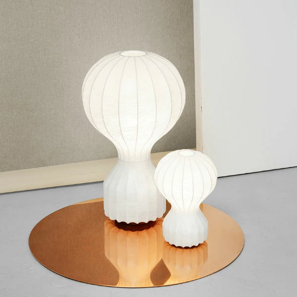 Designed by Achille CastiglioniManufactured by FlosThe Flos Gatto Table Lamp provides a beautifully soft diffused light. It can be used as a table lamp, bedside lamp or desk lamp.The Gatto is made from a white powder-coated internal steel structure that is sprayed with a unique ‘cocoon’ resin which creates the diffuser. The Gatto is available in two sizes.