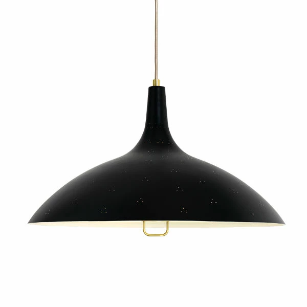 Designed by Paavo TynellManufactured by GubiThe 1965 Pendant reflects the distinguished craftsmanship of the legendary Finnish designer, Paavo Tynell.The 1965 Pendant was originally designed by Tynell in 1948. Like many of his best-known designs, the pendant was designed for the Finland House in New York, one of the most ambitious and successful projects of all time to showcase Finnish design. Tynell developed the 1965 Pendant with his exceptional ability to capture and translate a grace and exuberant lightness into his brass creations. Characterized by its triangular perforation pattern and frosted glass diffuser that softens the light, the pendant contributes to a subtle and tranquil environment.