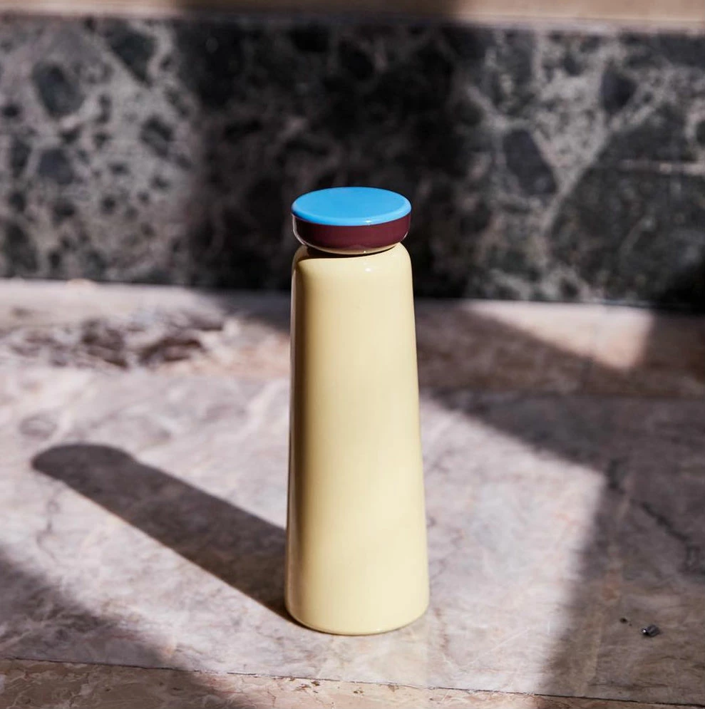 Designed by George SwodenManufactured by HayColourful Vacuum FlaskThe Sowden bottle named after George Sowden is part of the Bottle series characterised by contrasting colours and a playful expression. The Sowden bottle doesn’t look like a conventional vacuum flask. Thanks to its practical features as well as its modern and colourful appearance, the bottle is ideal for when you are on the go.Stainless Steel with Plastic Screw CapThe functional design made of stainless steel with a plastic screw cap is suitable to transport both hot and cold drinks. Ginger tea for breakfast and drinks between meals can now be safely insulated thanks to the drip-free screw cap. Available in various sizes and colours.