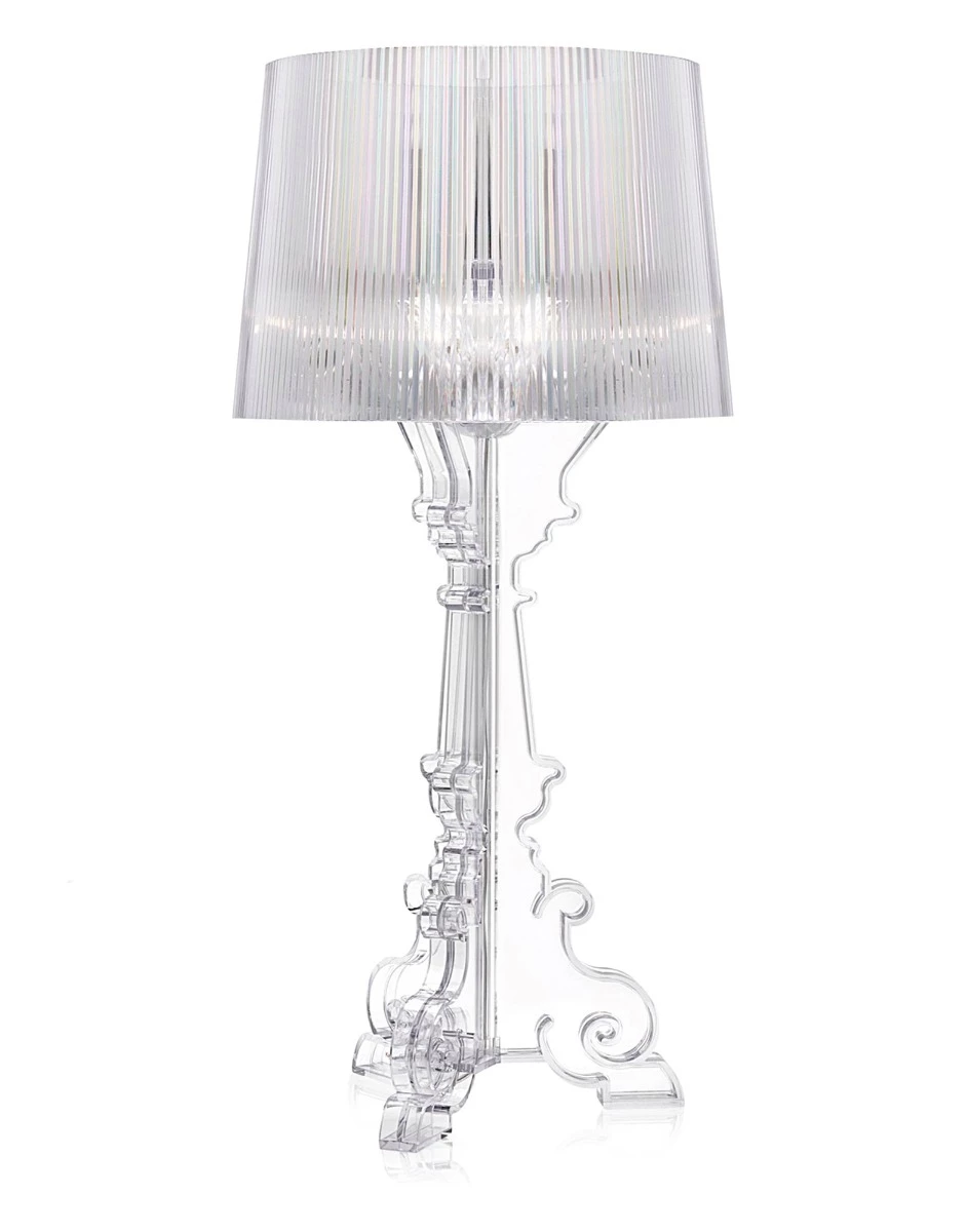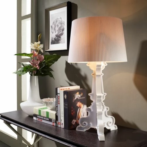 Designed by Ferruccio LavianiManufactured by KartellA lamp with an inimitable style, Bourgie is one of Kartell’s best sellers, skilfully combining classic style, richness and tradition with innovation and irony. The baroque style base is composed of three interconnecting decorated layers, while the large lampshade is made with a pleated effect, to create a myriad play of reflections when the lamp is turned on.The lamp shade’s unique attachment system makes three different heights possible which can be adjusted according to the desired use: 68, 73 and 78 centimetres.Bourgie becomes a gorgeous decorative desk or table lamp. Thanks to its flexibility and strong communication value, it can be used on an side-table in the living room, to create atmosphere on your nightstand, as a standing sculpture or for reading.