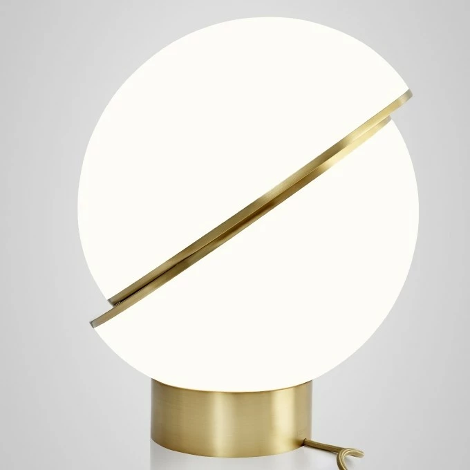 Designed by Lee BroomManufactured by Lee BroomA true statement piece, the Crescent Table Lamp by award-winning designer Lee Broom demonstrates how subtle adjustments to simple forms can constitute a uniquely captivating design. Expertly crafted from steel with a brushed brass finish, the centrepiece of this lamp is the opaque acrylic sphere that has been sliced in half to reveal a crescent-shaped brushed brass fascia. Featuring a high power LED bulb the Crescent Table Lamp has presence and luminosity, seamlessly combining the solid and the opaque. Also available in a smaller size, the Crescent Table Lamp emanates a gently diffused light and would make the perfect focus for any living space.