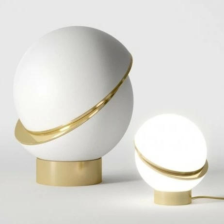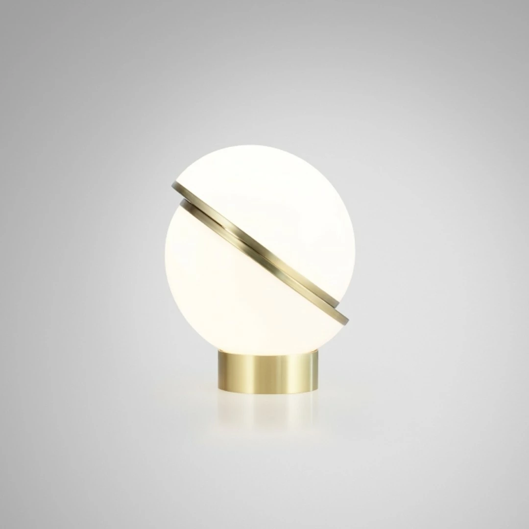 Designed by Lee BroomManufactured by Lee BroomA miniature version of the popular Crescent Light, this illuminated sphere is sliced asymmetrically in half to reveal a crescent-shaped brushed brass fascia. Mini Crescent seamlessly combines the solid and the opaque.