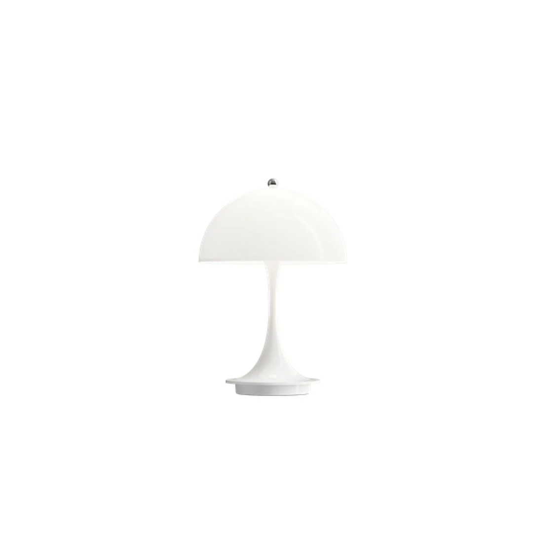 Designed by Verner PantonManufactured by Louis PoulsenThe fixture lights up any space harmoniously without glare. The portable table lamp is available in opal, and the transparency of the shade and the reflection of the downward light on the inner side of the shade provides a gentle light and subtle ambience.