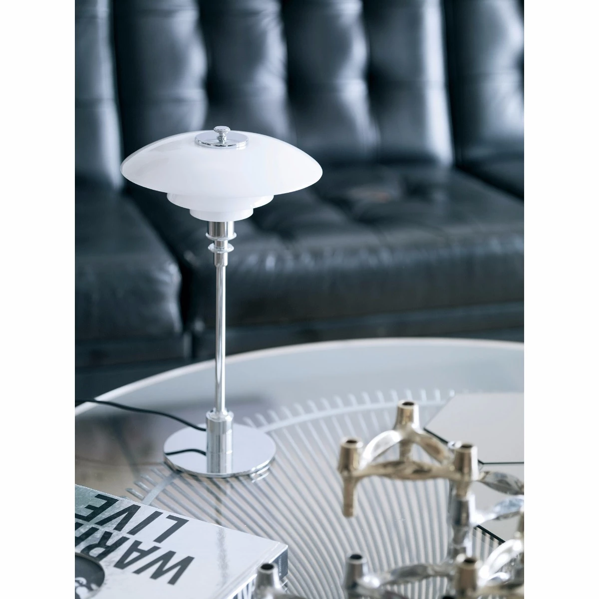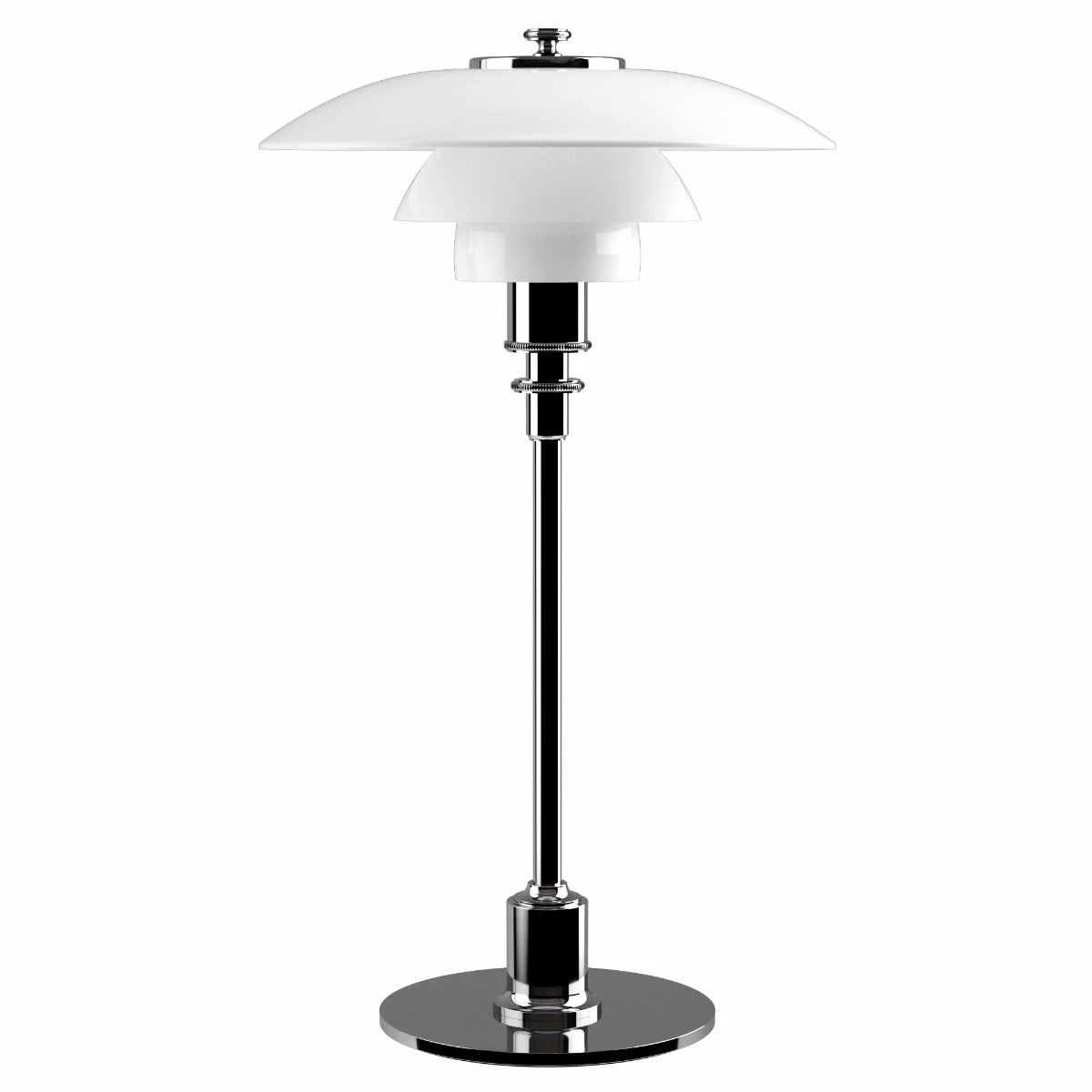 Designed by Poul HenningsenManufactured by Louis PoulsenThe Louis Poulsen PH2/1 table lamp, designed by Poul Henningsen, is a three-lampshade system. Embodied in a delicate table lamp with shades in white opal glass the PH 2 / 1 acts as a younger brother.The PH 2 /1 is 35,50 cm tall and with a lampshade of only 20 cm in diameter, this small version can be placed almost everywhere like in a windowsill or at a small bookcase.