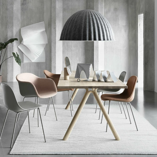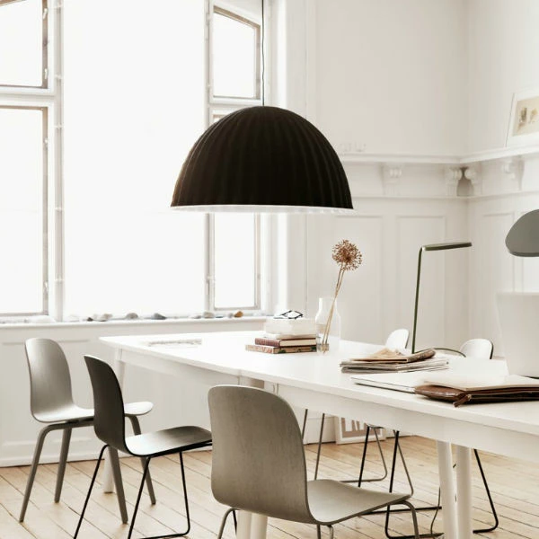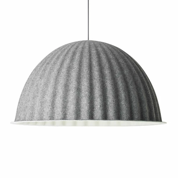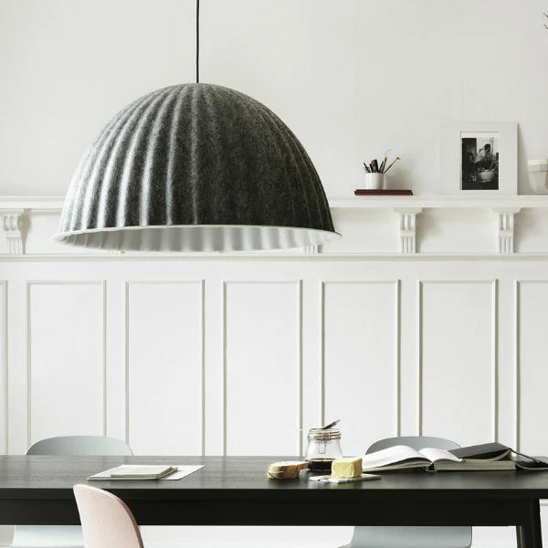 Designed by Iskos–BerlinManufactured by MuutoThe Under The Bell Pendant Light by Muuto has a beautiful tactile texture and classic shade structure.The light’s striking size shelters both people and objects below, elegantly enhancing a space and providing an atmosphere of comfort and security. The light is made from recycled plastic felt which works to absorb sound, helping improve the acoustics of a room. Available in black or grey, Under The Bell has been designed to adapt effortlessly into large open spaces, ideal for restaurants, hotels, work environments or education institutions.