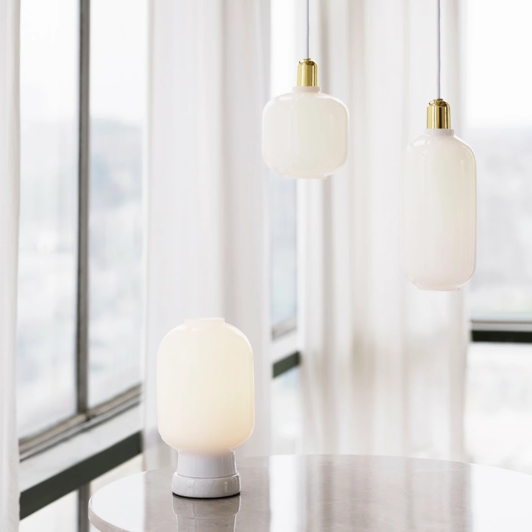 Designed by: Simon LegaldManufactured by: Normann CopenhagenAmp is a range of small lamps inspired by old tube amplifiers from the 1960s. The unique shapes and classic materials of marble and glass add a nostalgic and at the same time, contemporary feel to Amp.The decorative bulb emits a stunning glow through the gold/green and smoke/black glass lampshades, while the opaqueness of the White/White glass highlights the shape of the lamp, making it appear as a pure and ghostly aesthetic silhouette.The lamp collection produces a beautiful and comfortable light, and the sophisticated design can form a part of many different interior decors. Hang one Amp Lamp in the hallway, in a corner of the living room, or create a cluster of Amp Lamps over your dining room table for modern ballroom effect.Pendants with smoke glass are provided with a 4 m black textile cord and a black canopy.