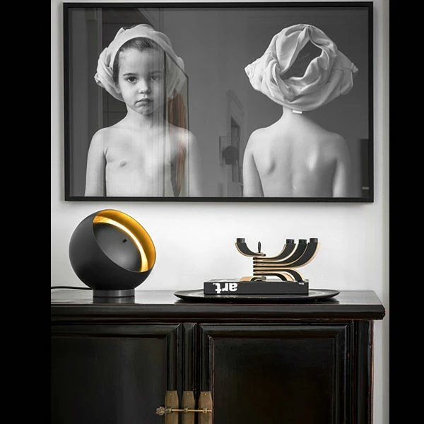 Designed by Francesca BorelliManufactured by OluceEva is a metal table lamp that investigates opposites, hollow and solid, light and dark, taking them from theory into practice. The interaction between humans and objects takes on a fundamental significance, adding a playful and continually surprising element to the light.The body of the object is a ball containing the LED light source; it is open on one side and stands on a slim cylindrical base. The inside of the ball is concealed by a surface that almost perfectly completes it, closing it like a sphere that recomposes itself, with the exception of a circle, a luminous light spiral that recalls the phenomenon of an eclipse. As this circular surface moves towards the interior or exterior of the ball, it allows different amounts of light to pass through, creating intimate, suffuse atmospheres, and revealing glimpses of the fine gold leaf walls inside the Eva lamp with varying degrees of clarity.The design is available in two versions: white or black, timeless colors that recall the moon and the astronomical phenomena that conceal it.