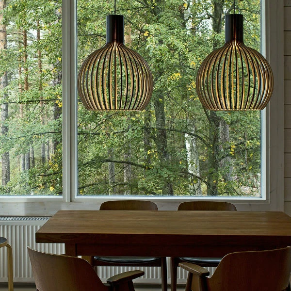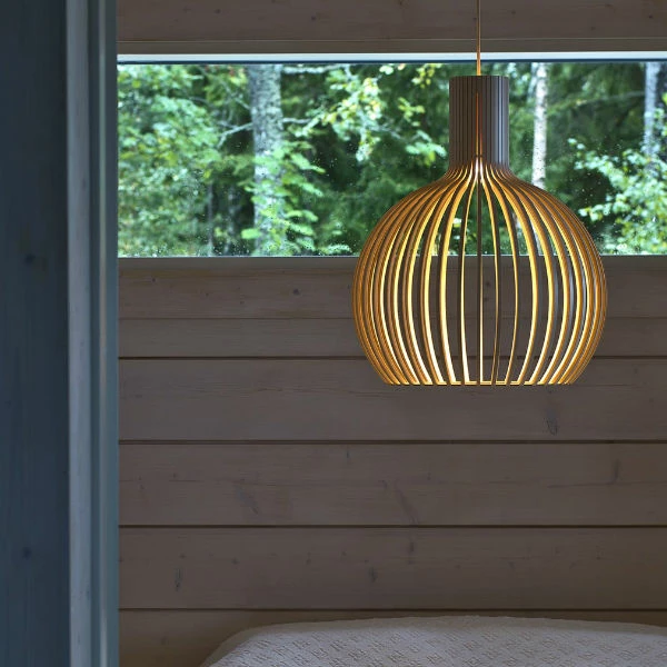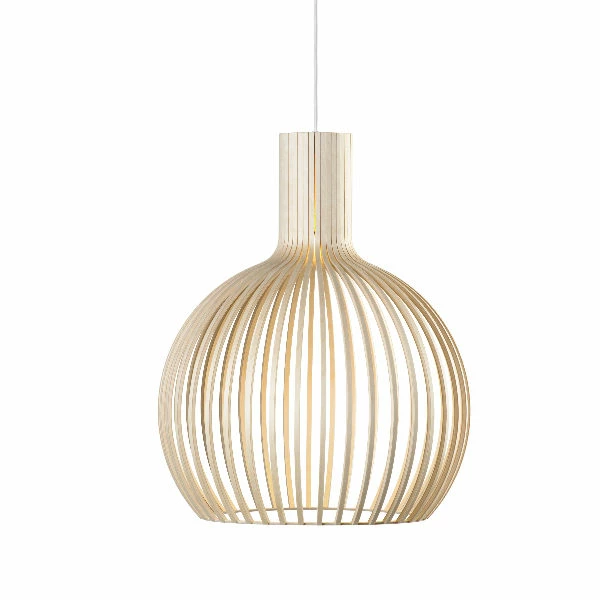 Designed by Seppo KohoManufactured by SectoThis much anticipated compact model of the classic Octo is beautiful on its own, in a row or in groups in any interior.Secto lighting fixtures are manufactured from pressed birch and intricately handcrafted by Finnish cabinet-makers.The Secto pendants, designed by interior architect Seppo Koho, has a clear and simple Scandinavian feel. The wood provides a luminosity to create atmosphere and appeal. Available in natural birch, white laminated birch, black laminated birch or in walnut veneer.