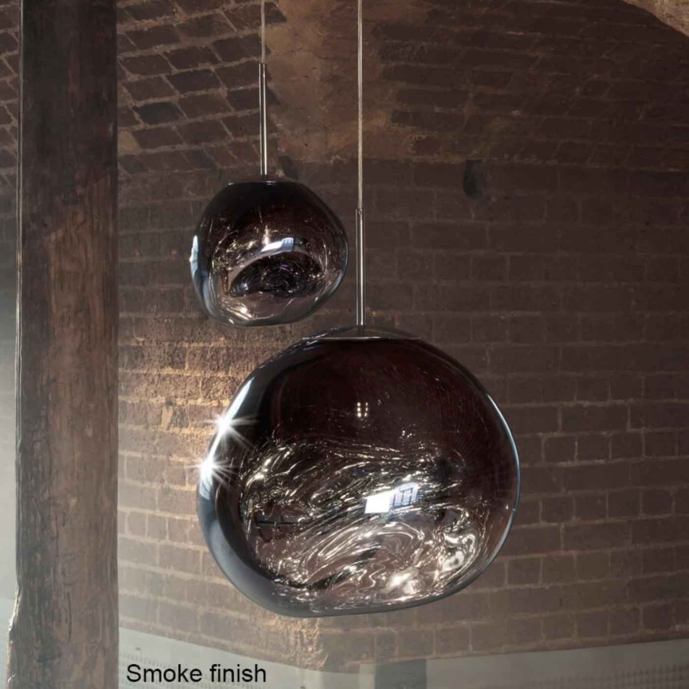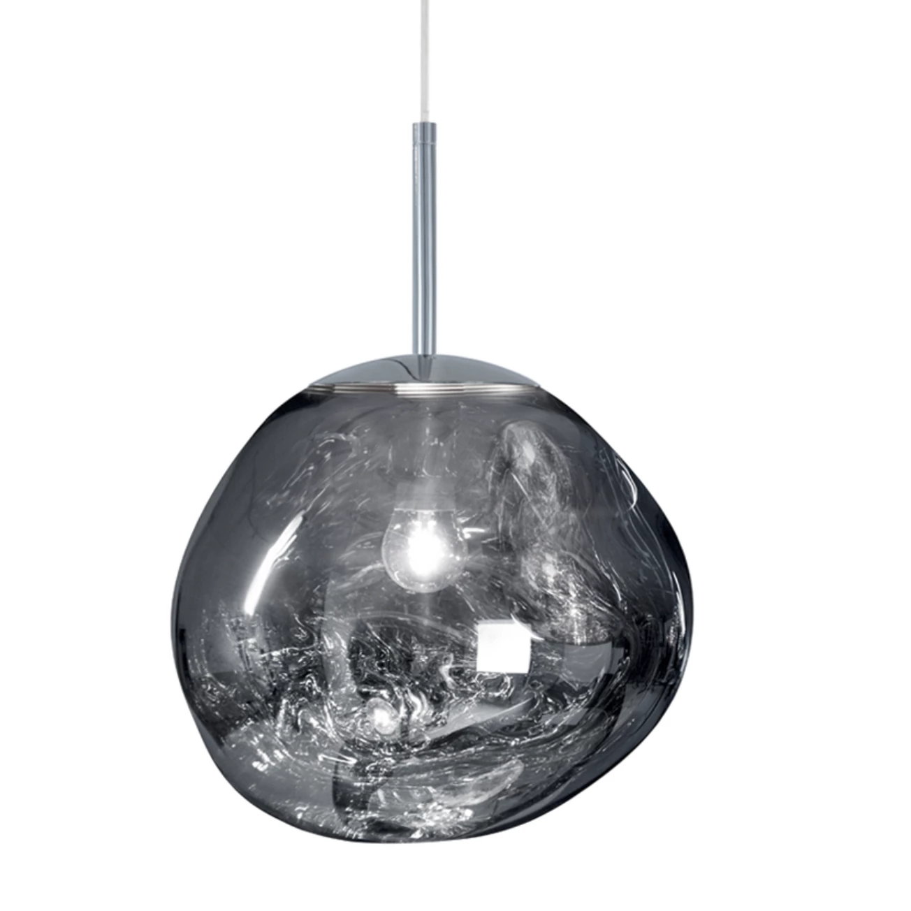 Designed by Tom DixonManufactured by Tom DixonThe Tom Dixon Mini Melt Pendant Light is a distorted spherical pendant, half-metallised to create an extraordinary optic effect.With Melt, Tom Dixon experiments in the technologically advanced field of vacuum metallisation, creating a bold new twist to lighting design. Melt is translucent when on and mirror-finish when off, casting an ethereal luminosity to its surroundings. Creating a truly magnificent visual effect, the pendant embodies a striking contemporary design, working well in a cluster in larger commercial spaces or when hung individually in a hallway or dining space.