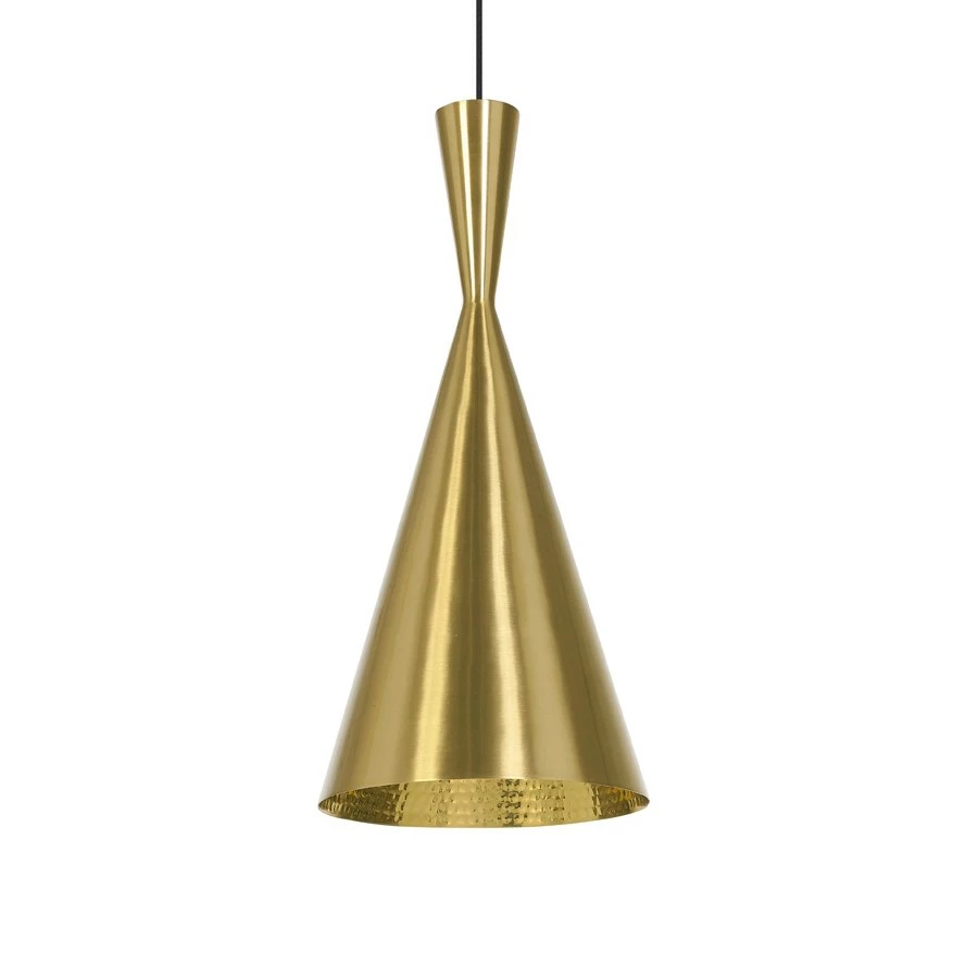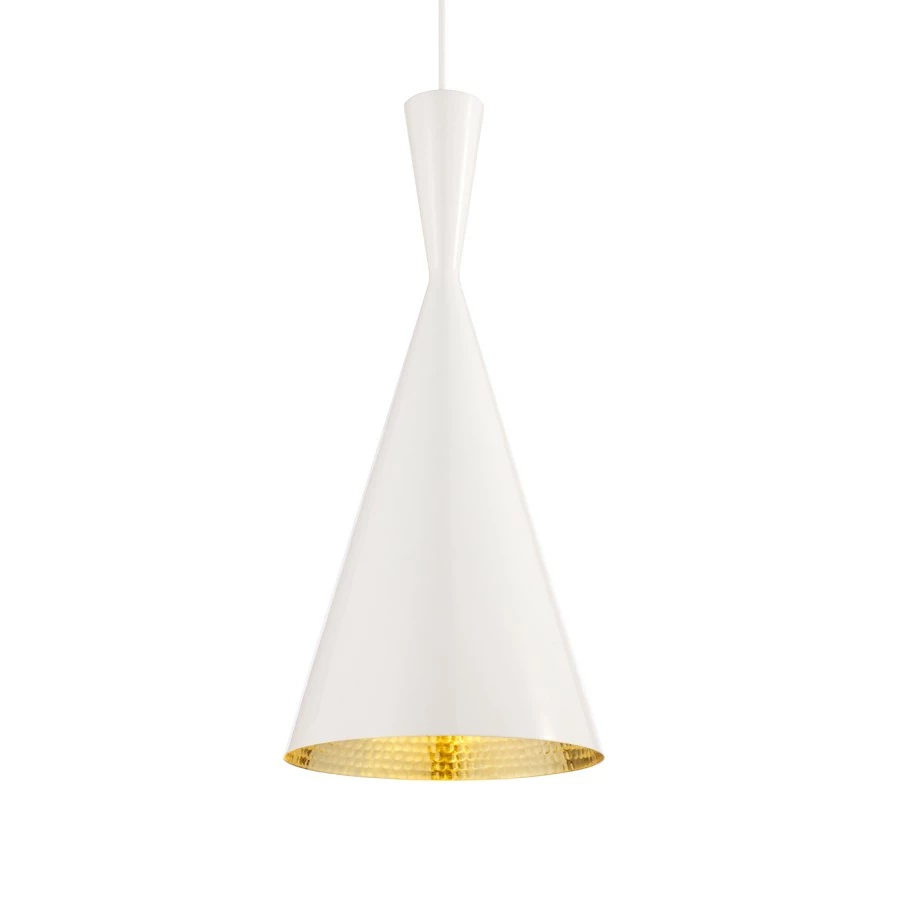 Designed by Tom DixonManufactured by Tom DixonThe tall Tom Dixon Beat pendant light was inspired by the simplicity of brass cooking pots and water vessels from the Indian subcontinent.Beat Light Tall is spun and hand-beaten by the world-renowned craftsmen of Moradabad in northern India. The Beat Light collection also includes Fat, Wide and Stout and comes in white, grey and brushed brass. Beat Light creates a dramatic statement if hung in multiples with different shapes.